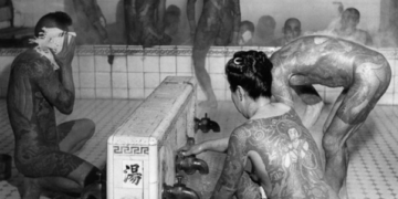 Yakuza public baths, Japan 1947. Work by Horace Bristol. Bristol was in Japan after World War II. One of his projects was documenting Japanese tattoo...