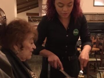 Last night, we went to Olive Garden for dinner. My mom, who is 79 years old, chose to sit at the corner of the table...