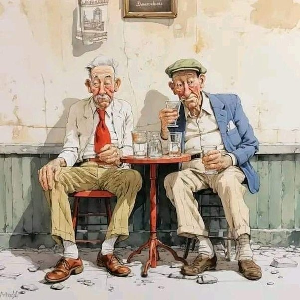 Two old men are sitting in a bar.